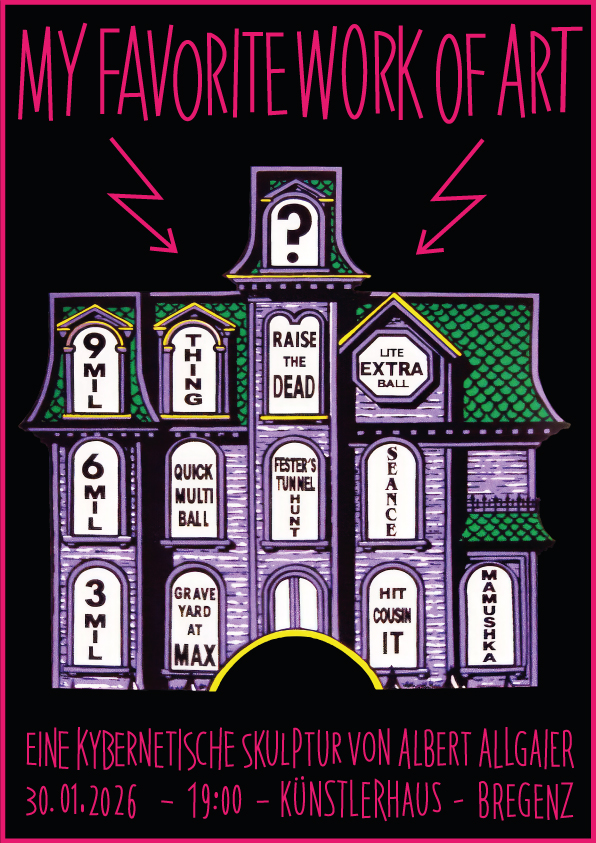 Die Arbeit „My favorite work of art“ ist tatsächlich das persönliche Lieblingskunstwerk von Albert Allgaier: Der Flipperautomat „The Addams Family“ von 1992. In der Tradition des Ready-Mades erklärt der Künstler die Maschine allein durch ihre Platzierung im Ausstellungsraum zum Kunstwerk. Die tatsächliche Benutzbarkeit der Maschine wirft jedoch Fragen zur Funktionalität von Kunst und Kunsträumen auf, die über die Duchamp’sche Geste hinausgehen. Die dem Titel immanente Reflektion auf den Kunstbegriff wird hier nicht nur personalisiert (MY!), sondern in seiner Erfahrung teilbar gemacht (bis zu vier Spieler gleichzeitig): eine soziale Skulptur entsteht. Die Haptik, der Klang, die Lichter erzeugen eine multi-sensorische Erfahrung und resultieren in einer kybernetischen Choreografie zwischen Mensch und Maschine. Zu gewinnen gibt es nichts außer Zeit, und zwar während man sie verliert.