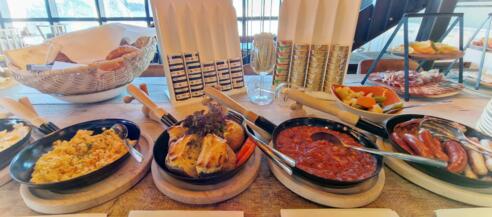 Warme BBQ-Eierspeisen, ausgewählte Würste, langsam gegartes Pulled Pork, gefüllte Ofenkartoffel, Räucherlachs, alpine Käsesorten und frisches Brot – begleitet von Kaffee, Prosecco und sorgfältig ausgewählten Säften.