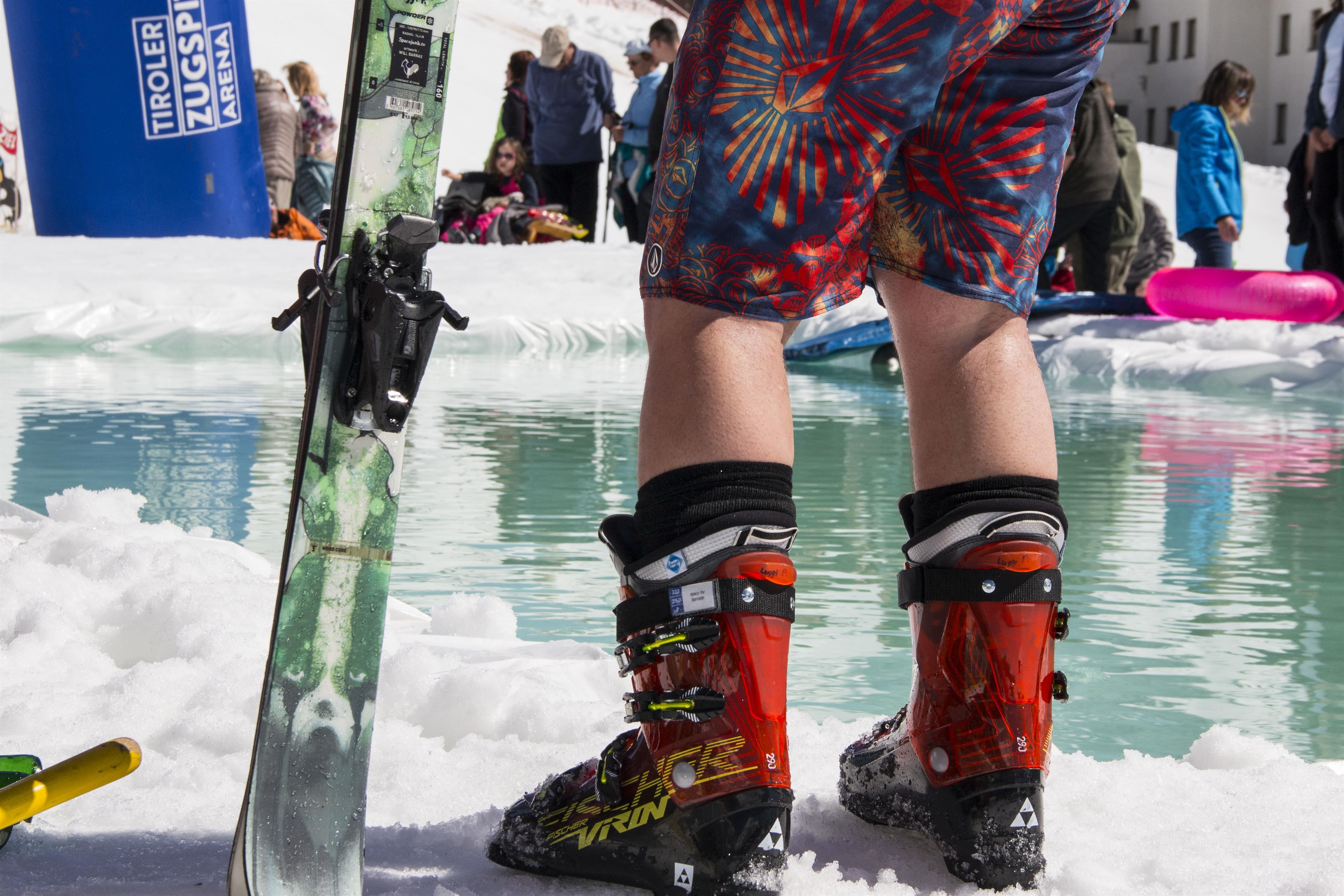 Beim Waterslide Contest versuchen die Teilnehmer mit Skiern oder Snowboard - und mit dem nötigen Schwung - ein 8-10 Meter langes Becken zu überquerem ohne dabei im Wasser zu versinken.