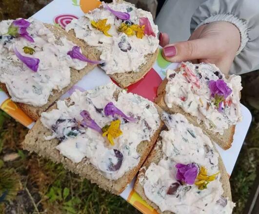 Zum Abschluss genießen wir ein Kräutergetränk und dazu verkosten wir Blüten-Aufstrichbrote.