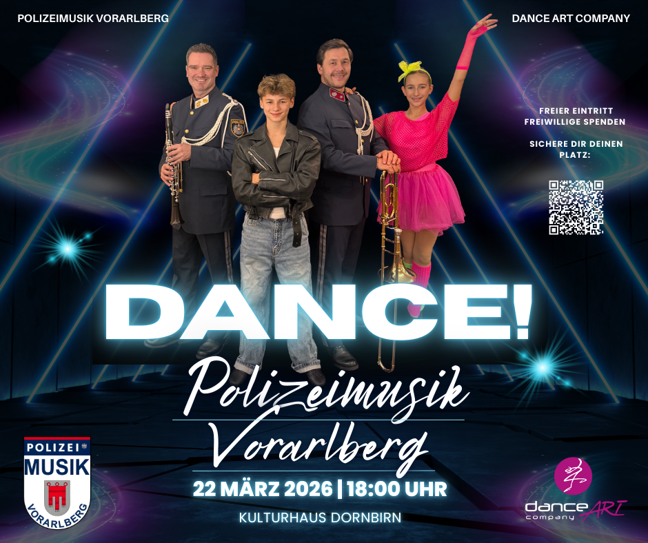 Unter dem Motto „Dance!“ dreht sich alles um Rhythmus, Bewegung und mitreißende Musik. Freu dich auf ein abwechslungsreiches Programm, das Tanz und Klang miteinander verbindet. Als Special Act sorgt die Dance Art Company aus Dornbirn mit starken Choreografien für zusätzliche Energie auf der Bühne.