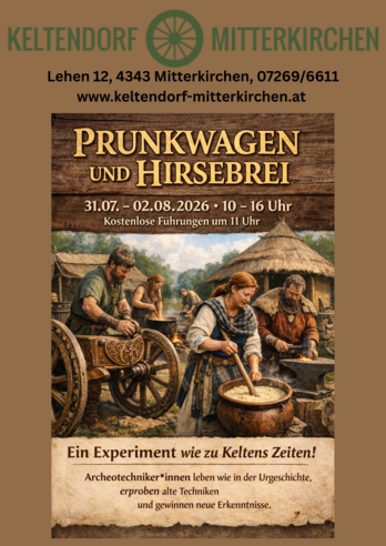 Auch 2026 wird wieder eine Gruppe von Expert*innen der Archäotechnik Freitag, 31.Juli bis Sonntag, 02.August die eisenzeitliche Kultur in allen Facetten im Keltendorf Mitterkirchen vermitteln. Authentische Kleidung, Hausrat, Werkzeuge und Nahrungsmittel unserer Vorfahren aus der Hallstattzeit stehen dabei im Mittelpunkt und regen zu Gesprächen an. Gemeinsam mit den Teilnehmerinnen und Teilnehmern von Prunkwagen und Hirsebrei kann jeden Tag um 11:00 Uhr das Dorf bei einer kostenlosen Führung noch einmal anders erlebt werden. |