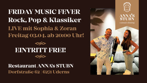 Coole Drinks, lässige Stimmung und echte Livemusik mit SOPHIA & ZORAN! Freu dich auf einen bunten Mix aus Rock, Pop, Oldies, Klassikern und vielem mehr. Einfach zurücklehnen, genießen und den Abend musikalisch ausklingen lassen. Eintritt frei.