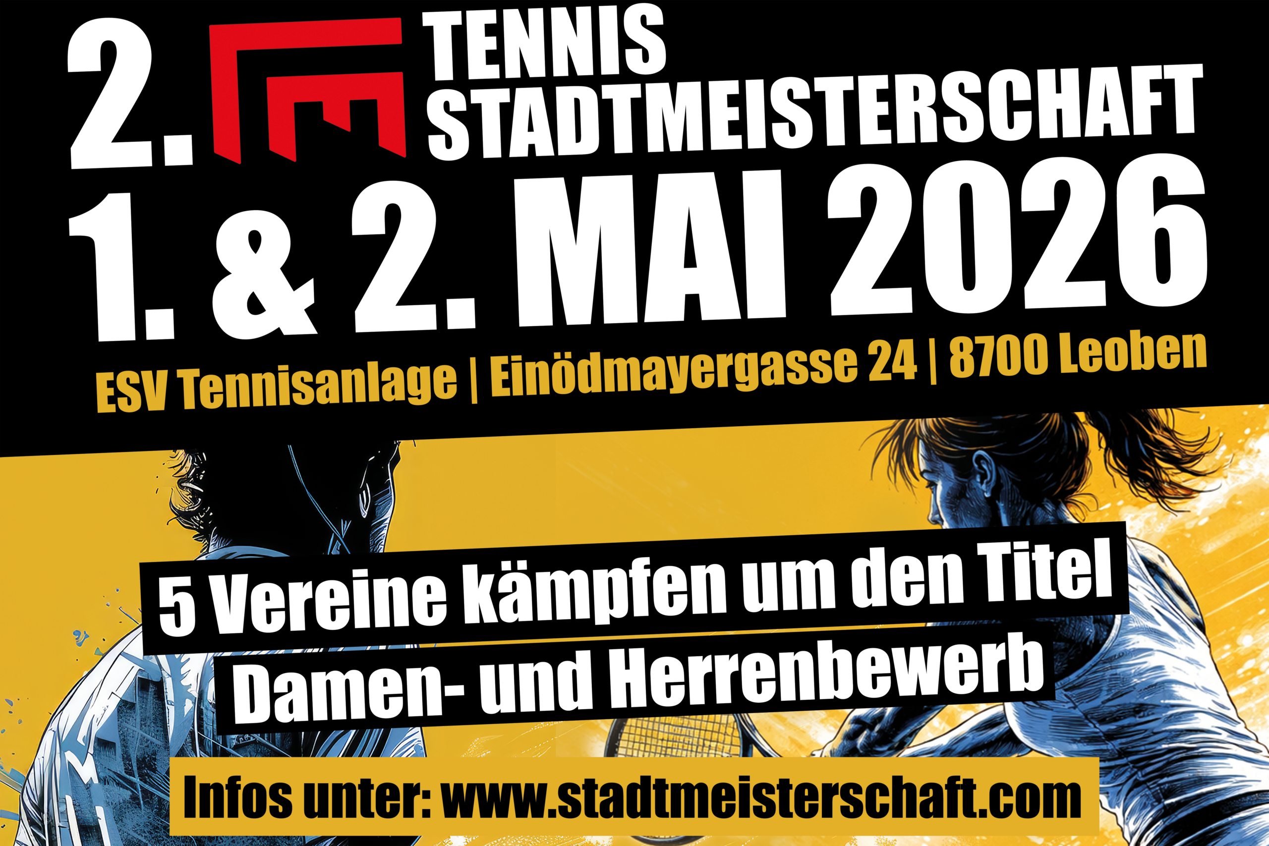 Nach der erfolgreichen Erstauflage lädt die Sektion Tennis des ESV Leoben im Jahr 2026 zur zweiten LE Stadtmeisterschaft ein. Neu im Jahr 2026 ist ein eigener Damenbewerb, in dem erstmals die LE Stadtmeisterin gekürt wird. Zuschauerinnen und Zuschauer aller Altersgruppen sind herzlich eingeladen, an diesen 2 Tagen bei den spannenden Matches mitzufiebern. Die Finalspiele finden am 2. Mai ab ca. 14:30 Uhr statt. Im Anschluss folgen Siegerehrung, Tombola und Abschlussparty mit Livemusik.