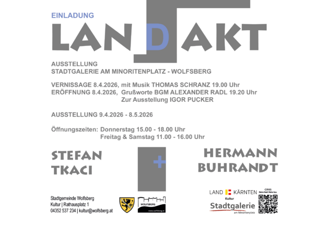 Die neue Ausstellung „Landakt“ in der Stadtgalerie am Minoritenplatz präsentiert Werke der Wolfsberger Künstler Stefan Tkaci und Hermann Buhrandt. Die Eröffnung findet am Donnerstag, 8. April 2026, um 19 Uhr statt. Die Ausstellung ist bis 8. Mai 2026 zu sehen.