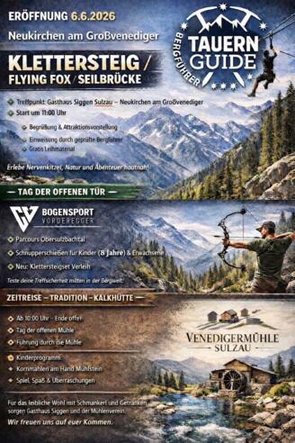 Eröffnung des neuen Klettersteigs mit Flying Fox & Seilbrücke. Tag der offenen Tür der Venedigermühle Sulzau.