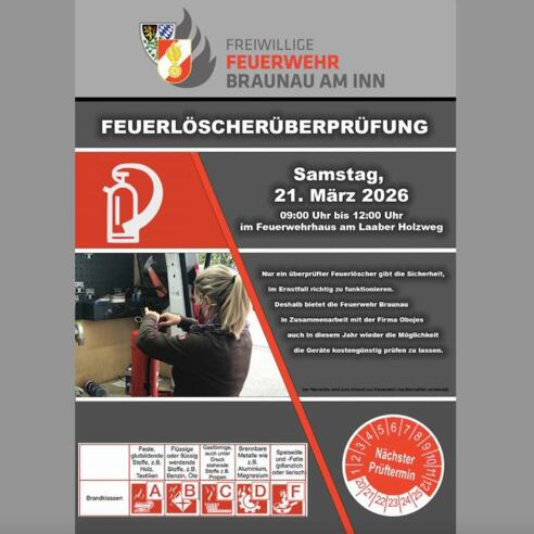Nur ein überprüfter Feuerlöscher gibt die Sicherheit, im Ernstfall richtig zu funktionieren. Deshalb bietet die Feuerwehr Braunau in Zusammenarbeit mit der Firma Obojes auch in diesem Jahr wieder die Möglichkeit, die Geräte kostengünstig prüfen zu lassen.