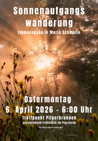 Am Ostermontag, 06. April 2026 sind alle Interessierten herzlich eingeladen, bei der Sonnenaufgangswanderung (Emmausgang) mitzugehen und zurückzublicken auf ein Fest der Auferstehung und des Neuanfangs. Es ist ein wunderbares Gefühl, den Sonnenaufgang in der Gemeinschaft mitzuerleben, der die Auferstehung symbolisiert. So gilt der April mit dem Frühlingserwachen als Monat des Lebens – überall grünt und blüht es. In diesem Sinne kann es guttun, bei Spaziergängen einfach die Natur zu beobachten, Kraft zu schöpfen, auszuruhen oder mit vielen guten Gedanken durchzustarten.
