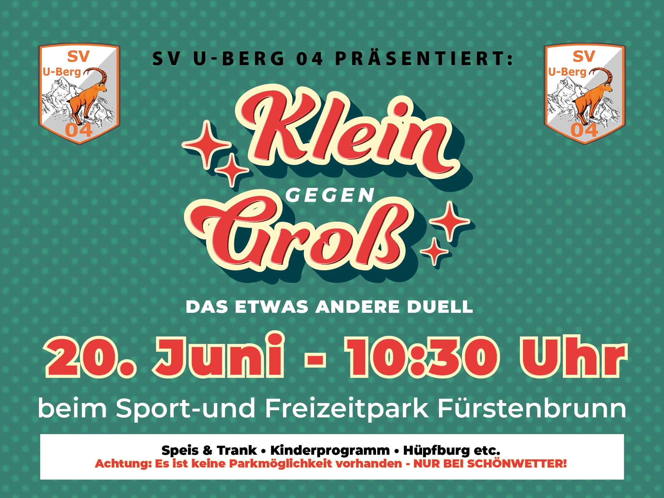 SV U-Berg 04 präsentiert am 20. Juni 2026 wieder das Duell "Klein gegen Groß" - das etwas andere Duell. Hier gehts nicht um höher, weiter, schneller - sondern um Spaß für die ganze Familie! Jedes Kind darf sich einem "Großen" messen - das kann Mama oder Papa sein, aber auch Oma, Opa, Tante oder Onkel, ganz egal. Im Mittelpunkt stehen Geschicklichkeit, gute Laune und das Miteinander.