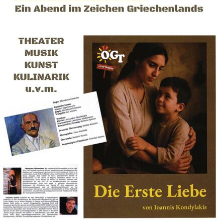 Ein Abend im Zeichen der griechischen Kultur! Ein außergewöhnliches Kulturexperiment erwartet Sie! Die Griechisch‑Österreichische Theatergruppe „…zur Sonne“ bringt das berührende, auf Kreta angesiedelte Theaterstück „Die erste Liebe“ auf die Bühne – in griechischer Sprache mit Übertiteln. Eine seltene Gelegenheit, diese Form des Theaters außerhalb Wiens zu erleben!