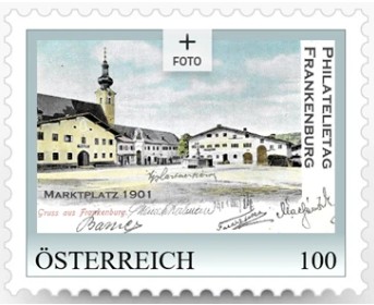 Die personalisierte Philatelietagsmarke zeigt diese Mal eine alte Ansicht des Marktplatzes von Frankenburg. Das Bild zeigt die Südwestseite des Platzes mit der Pfarrkirche. Die Aufnahme stammt aus dem Jahr 1901.