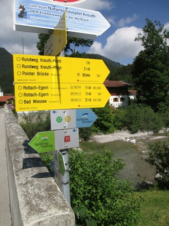 Fast ebene Kieswege, für Kinder ein echtes Abenteuer. Gehzeit in ca. 3 Stunden mit Verweilen an den Stationen einberechnet. Start ist an der Riedlerbrücke in Kreuth (Parkplatz). Direkt danach beginnt rechts der Erlebnisweg am östlichen, (in Flußrichtung rechten Ufer). Erste Stationen liegen auf dem Abschnitt bis zu Pointerbrücke. Am rechten Flussufer bleiben und zu weiteren Lern-und Spielstationen. Der östliche Abschnitt endet an der Pförner Brücke. Ich bin aber weitergegangen bis zum Ortsrand von Rottach-Egern und erst über die Wallbergbrücke am Westufer nach Kreuth-Riedlern zurückgewandert. Bin aber an der Pointerbrücke erneut ans Ostufer gegangen und in der Weißachalm eingekehrt (Siehe Fotos).