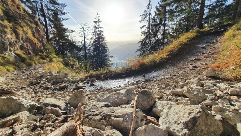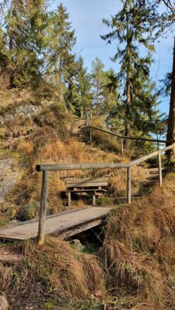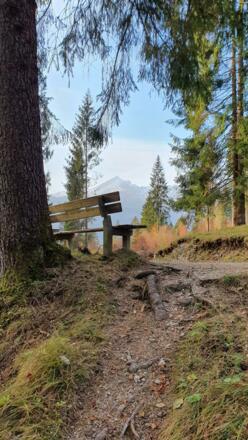 Ab hier geht es auf einem schönen Naturpfad weiter, gespickt mit Stufen, Wurzeln, Schotter, bergauf- und Flachpassagen. Sobald du die kommenden 850 Meter und 100 Höhenmeter auf dem Steig hinter dir gelassen hast, halte dich links in Richtung „Grasberg“, hier kannst du etwas verschnaufen, denn du hast bis zum Forstweg ein entspanntes Stück vor dir.