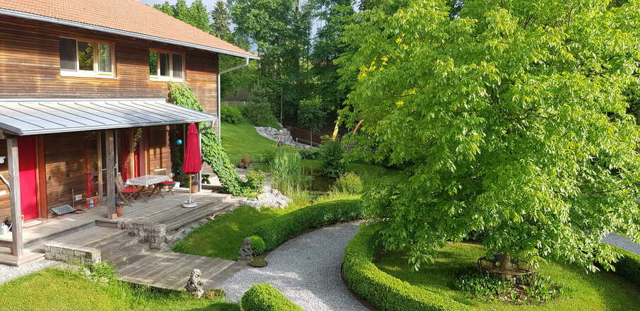 Das Haus ist landschaftlich schön gelegen auf einer Anhöhe über dem Inn in der Ortschaft Attel einem Ortsteil von Wasserburg am Inn. Auf dem großen parkähnlich angelegten Grundstück mit altem Baumbestand und zwei Teichen sind insgesamt zwei Wohnhäuser und ein Nebengebäude. Das Grundstück ist abgeschlossen. Der ruhige beschauliche Ort bietet Erholung vom Alltag. Spaziergänge, Fahrradtouren oder Ausflüge in die Umgebung bieten sich an. Sie wohnen in einem Massivholzhaus in ökologischer Bauweise. Dazu gehören Lehmputzwände, sichtbare Holzdecken und – Wände und Verwendung von Sumpfkalkfarbe etc... Fußläufig ist der Attler Markt (Lebensmittel: frisch, regional / Eigenproduktion und Bio) und das Restaurant Fischerstüberl erreichbar. Den Frühstücksemmelservice gibt es von Montag bis Freitag ab ca. 7:00 Uhr Entfernungen Autominuten: 10 Minuten von Wasserburg, 20 Minuten von Rosenheim, 60 Minuten nach München oder Salzburg, 30 – 40 Minuten an den Chiemsee.