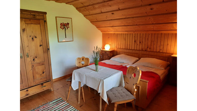 "Zurück zu Natur und einfacher Lebensweise" unter diesem Motto ist diese liebevoll gestaltete, rustikale Ferienwohnung mit Vollholzmöbel und traumhafter Aussicht. Genau das Richtige für Gäste, die absolute Ruhe und Abgeschiedenheit suchen. Genießen Sie die Alleinlage, das Ferienhäuschen steht separat neben unserem Bauernhof. Im Obergeschoß befindet sich unsere romantische, ländliche gemütliche Wohnung mit Doppelbett (Kinderbett bei Bedarf) Küche, Bad mit Dusche und großem Balkon mit Weitblick.