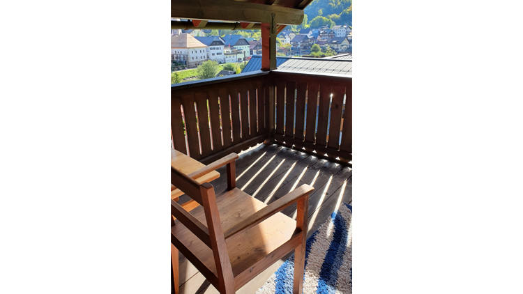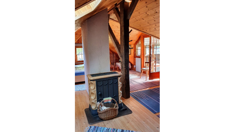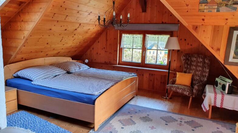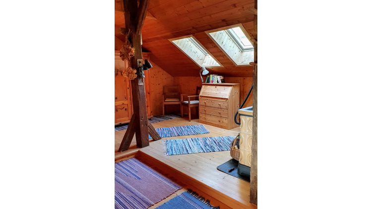 Im heimeligen Dachgeschoß finden sie Doppelbett, Sofa, Schreibtisch, Dauerbrandofen und Balkon.