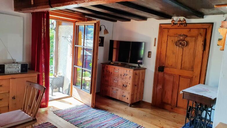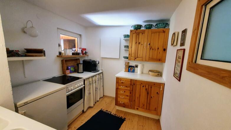 Im Erdgeschoß wartet eine große Stube mit Kachelofen, Küche, Bad und extra WC sowie eine Terrasse mit Sitzgelegenheit und kleinem Garten auf sie.