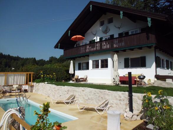 erster Stock, zentrumsnah (1km) und doch sehr ruhig in gepflegter Wohngegend, großer Garten zur Benutzung mit Grillplatz, 20m bis zu den Wander- und Spazierwegen, mit Blick zur Kampenwand.