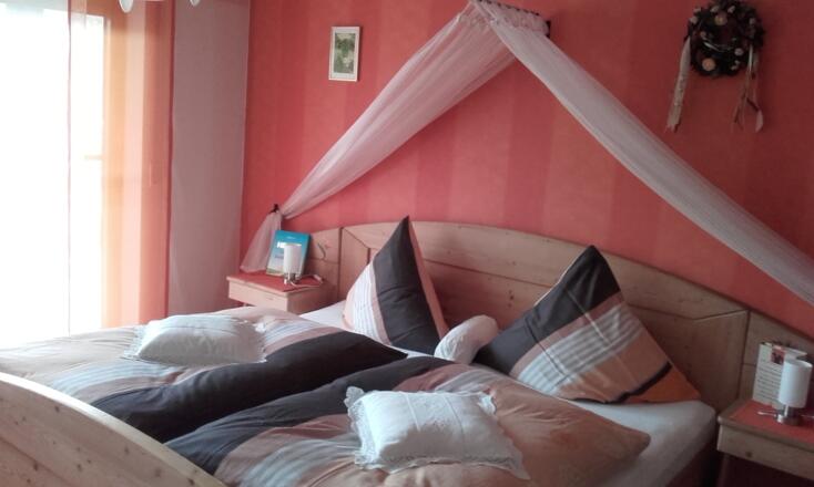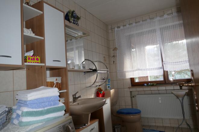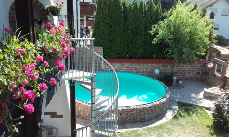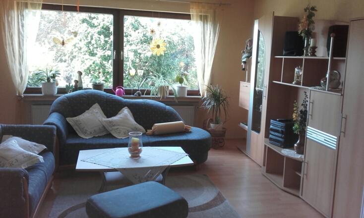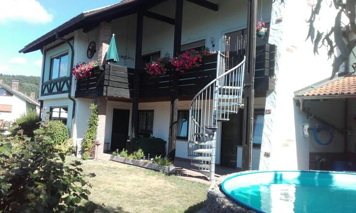 Ruhige Ferienwohnung am Südhang, direkt am Waldrand gelegen. 89 qm groß, mit Außenpool und großer Terrasse bietet Erholung für Ihren Urlaub. Separater Eingang, Auto-Stellplatz, Küche-Esszimmer voll ausgestattet, großes Wohnzimmer, TV & Internet-Anschluss sowie 2 Leihfahrräder vorhanden. Bettwäsche und Handtücher werden gestellt. 1-3 Nächte 38,- € für 2 Personen, je weitere Person 5 €; ab 4 Nächte 32,- € für 2 Personen, je weitere Person 5,- €. Frühstück auf Anfrage