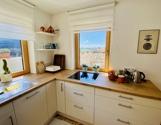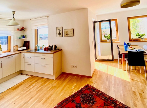 Moderne, offen gestaltete Ferienwohnung im Untergeschoß eines schönen Einfamilien-Wohnhauses mit separatem Eingang, eigener mediterran gestalteter Terrasse und PKW-Stellplatz. Die neue Wohnung hat eine Fläche von 62 m2 und verfügt über ein Schlafzimmer mit zwei Einzelbetten, die auch auf Wunsch zusammengestellt werden können, Kleiderschrank und Kommode, sowie einem Badezimmer mit Waschbecken, WC und Dusche. Der große, lichtdurchflutete Wohnraum besteht aus einer kleinen Sitzecke mit bequemem Ledersofa und TV-Gerät, einer Essecke mit Zugang zur Terrasse, sowie einer großen, komplett ausgestatteten Küche mit Marken Einbaugeräten. Idyllisch gelegen in Maierhof bei Soyen mit traumhaftem Panoramablick bis hin zu den Alpen. Zu Fuß erreicht man eine Gaststätte mit Biergarten und einen gut sortierten Lebensmittelladen. Rad- und Spazierwege beginnen mehr oder weniger vor der Haustüre. Im Umkreis von nur 2km befinden sich ein Bioladen, eine Pizzeria, ein Metzger und Bäcker sowie ein Badesee.