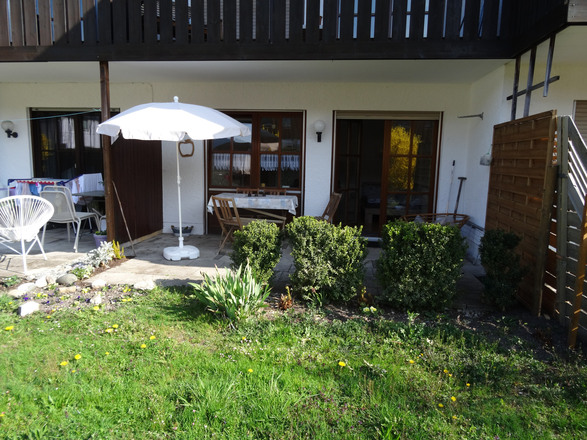 Die Wohnung ist ein helles 1-Zimmer-Appartement mit genügend Platz, eine ausziehbare Couch ermöglicht eine dritte Schlafgelegenheit, TV kann gesehen werden von Bett, Sofa oder Essecke. In der separaten Küche findet sich alles Notwendige, selbstverständlich auch Kaffeemaschine, kleiner Backofen und Kühlschrank, im Bad sind Dusche sowie WC, dazu Handtücher, Fön und zwischen Küche und Bad ist eine Garderobe. Bettwäsche wird gestellt. Fenster und Terrasse schauen nach Süden, die Liegewiese wird von einer Hecke begrenzt, auf der Terrasse sind eine Sitzgarnitur, Liegen, ein bequemer Ruhesessel sowie ein Grill. Das Haus liegt in einer sehr ruhigen Gegend und doch ist man in fünf Minuten im Zentrum des Ortes. Der zur Wohnung gehörende Parkplatz ist direkt vor der Haustür. Im Keller sind verschließbare Fahrradabstelle und ein Kellerabteil. Die Wohnung ist ganzjährig buchbar. Hinweis für Gehbehinderte: Von der Haustür führen sechs Stufen zur Wohnungstür.