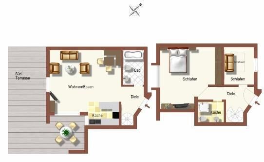 Die sehr gemütlich eingerichtete Wohnung hat eine sonnige Süd-Terrasse mit Garten und einen herrlichen Gebirgsblick. Sie besteht im Erdgeschoss aus einem Wohnzimmer mit einer Sitzgruppe und einer gemütlichen Sitzecke, einer komplett ausgestatteten Einbauküche sowie einem Wannenbad/WC. Von der Diele führt eine Wendeltreppe ins Untergeschoss, wo sich ein gemütlicher Schlafraum mit Doppelbett, ein kleines Schlafzimmer mit einem Stockbett (je 90x190) für 2 Personen und ein Duschbad/WC befinden. Die Wohnung ist komplett ausgestattet für 4 Personen. KINDER sind HERZLICH WILLKOMMEN ! Haustiere sind nicht erlaubt.