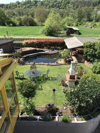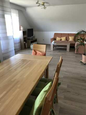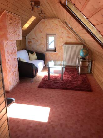 90 qm im 1. Obergeschoss unseres Hauses, komplett eingerichtet und gepflegt. 1 Doppelzimmer, weitere 3 kleine Einzelzimmer. Kein Aufzug. Mit überdachtem Balkon, fantastischer Ausblick ins Grüne und auf den nahe gelegenen Main. Direkt am Mainradweg.