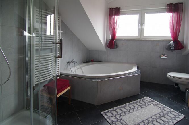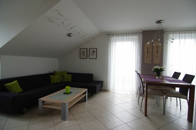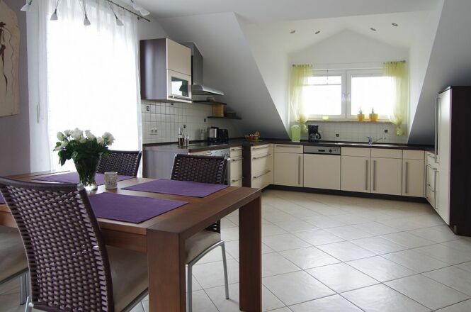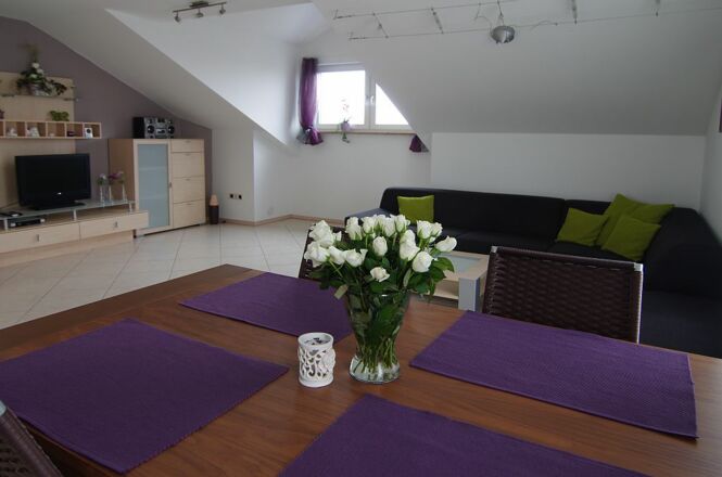Ferienwohnungsbeschreibung: Es erwarten Sie 120 m² Wohnfläche mit separatem Eingang und großzügigem Eingangsbereich. Die Wohnung (bis 5 Personen) mit hochwertiger Ausstattung ist liebevoll eingerichtet und lädt zum Wohlfühlen ein. - Karten und Gesellschaftsspiele stehen für Sie bereit - für die kleinen Gäste stehen Kinderbett und Hochstuhl zur Verfügung - alle Steckdosen mit Kindersicherung - Sie finden eine moderne, vollausgestattete Küche vor (Geschirrspüler, Kaffeemaschine, Mikrowelle, Wasserkocher usw.) - das Bad ist großzügig mit Eckbadewanne, Dusche und WC ausgestattet - ein separates Gäste WC ist vorhanden - zwei Schlafräume, von denen einer mit Doppelbett und gemütlicher Leseecke und der andere mit 3 Betten ausgestattet ist - zur Wohnung gehört ein großzügiger möblierter Balkon um schöne Stunden im Freien genießen zu können.