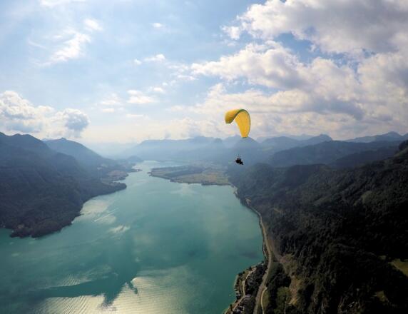 Das Zwölferhorn in St. Gilgen bietet uns dafür eine der schönsten Kulissen. Eindrucksvoll überfliegen wir den Wolfgangsee mit dem Paragleiter und genießen die perfekte Aussicht. Ein weiteres Fluggebiet von uns ist der Loser in Altaussee. Hier überfliegen wir den Altausseer See und bewundern den spektakulären Ausblick aufs Ausseerland.
