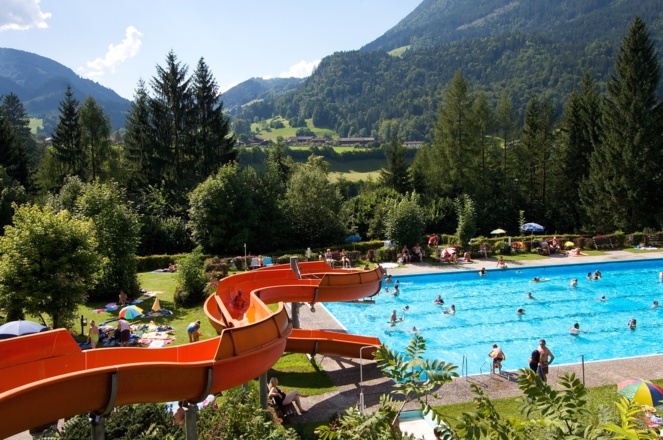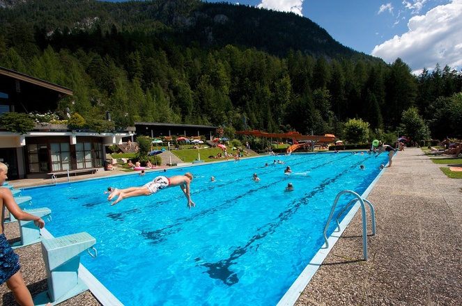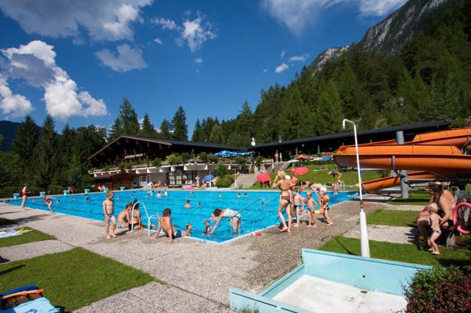 Inmitten von Wald und Fels erwartet Euch ein umweltfreundliches, gas- und solarbeheiztes Freibad, von dem Euch hoch über der Talsohle einen herrlichen Ausblick auf die umgebenden Berge und den freundlichen Ort Unken genießen.