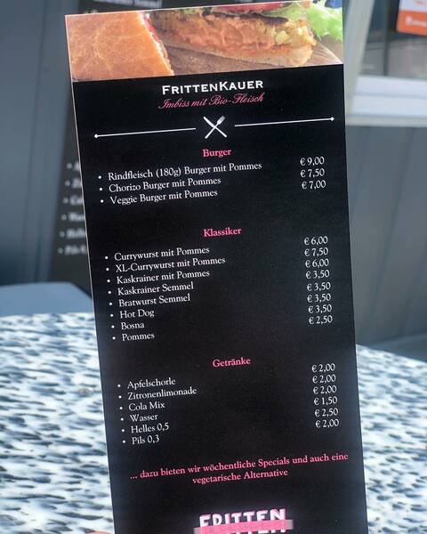 Bei uns gibt es Currywurst, Kaskrainer, Bosna, Pommes und dazu wöchentlich variierende vegetarische Gerichte.