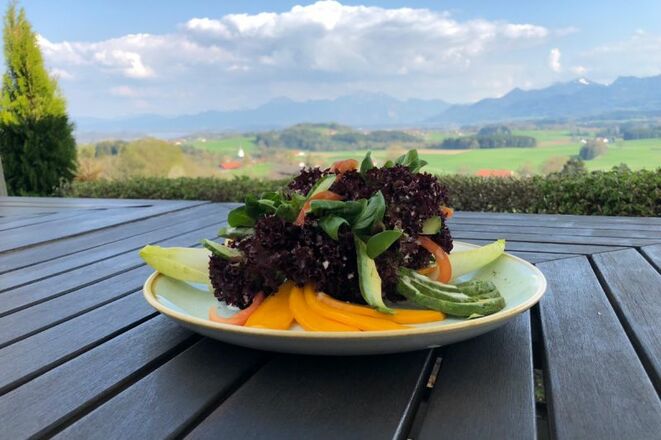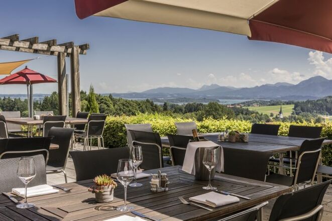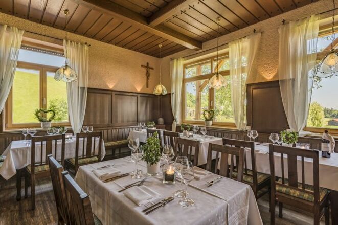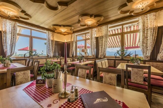 Nehmen Sie Platz auf der sonnigen Terrasse oder im Winter in dem gemütlichen Restaurant mit Stub´n und genießen Sie die bayerischen und internationalen Gerichte aus heimischen Produkten mit viel Liebe veredelt und für Sie zubereitet. Die phantastische Aussicht lässt den Besuch bei im Berggasthof zusätzlich zu etwas Besonderem werden. Von der Terrasse, dem Restaurant sowie dem Hotel blickt man über den Chiemsee und d auf das prächtige Panorama der Chiemgauer Alpen.