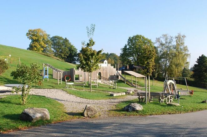 Besondere Attraktionen in unmittelbarer Nähe: Ein Abenteuer-Spielplatz und ein 16 Meter hoher Aussichtsturm mit Blick auf Simssee und Chiemsee.