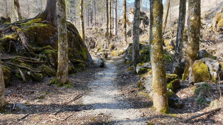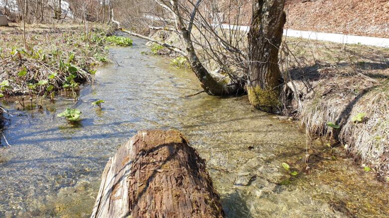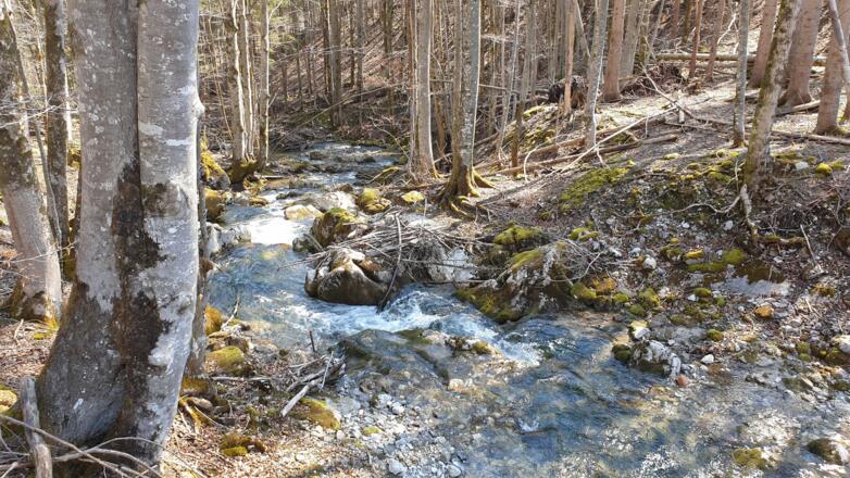 Zum Teichl Austritt gehen. Die Teichl fließt auf der Wurzeralm über den Teichlboden und versickert an dessen Ende. Beim Teichlaustritt kommt sie wieder zu Tage.