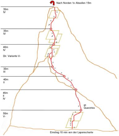 Zustieg: von der Hütte auf Weg Nr. 502 in ca. 1 h zur Lapenscharte; von dort in ca. 10 Min zum Einstieg