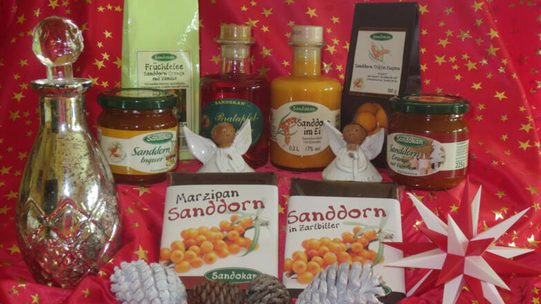 Produkte: Sanddornprodukte: Liköre, Marmeladen, Süßigkeiten, Tee, Sanddornkosmetik, Geschenkartikel und Verpackungen
