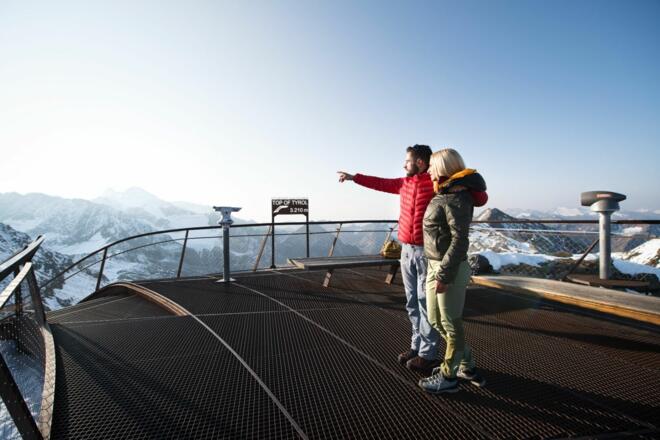 Tipp: In fünf Minuten gelangt man von der Bergstation der Schaufeljochbahn zur Gipfelplattform TOP OF TYROL. Auf 3.210 Metern Seehöhe eröffnen sich herrliche Ausblicke über zahlreiche Dreitausender bis hin zu den Dolomiten.