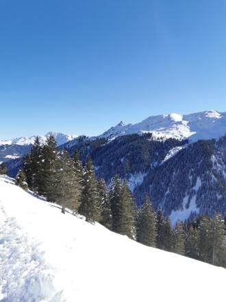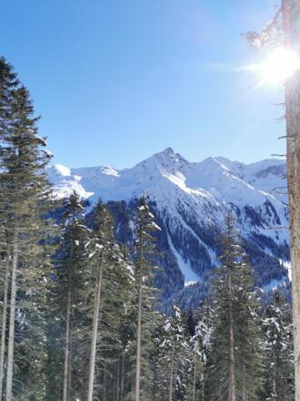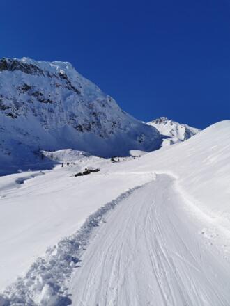 Wenn für die Abfahrt zu wenig Schnee liegt, kann über den Kamm zur Golmerbahn gegangen werden und von dort über die Piste abgefahren werden.