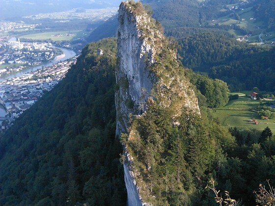 Herrlicher Tiefblick auf Hallein, ansonsten durch den Gipfelwald eingeschränktes Panorama.