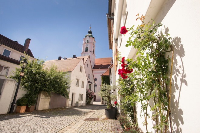 Wir fahren auf der Mühlstraße in den Ort ein, sehen rechts eine teilrenovierte Mühle und erreichen die Obergünzburger Straße. Hier biegen wir links Richtung St. Ulrich Kirche ab und radeln über den Marktplatz auf der Engetrieder Straße bis zum Ortsende, bis wir wieder an den Günztal-Radweg (Günzweg) gelangen.