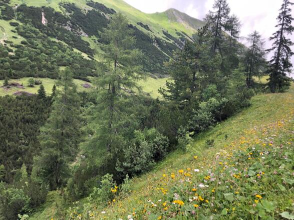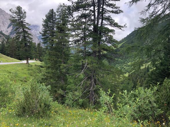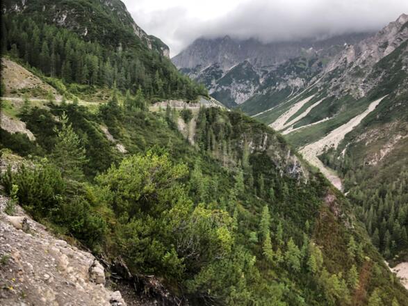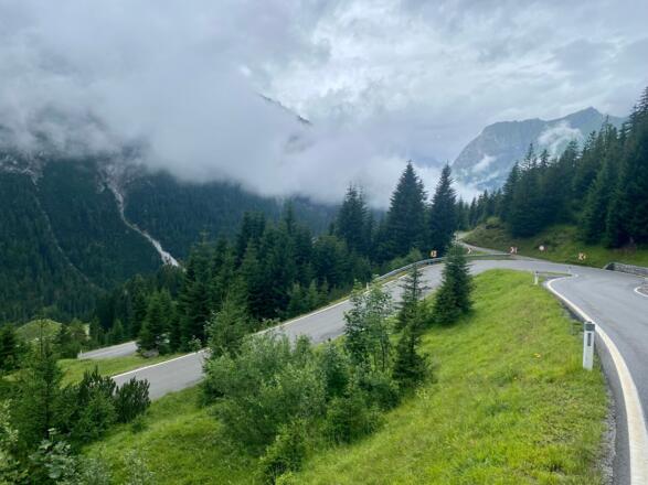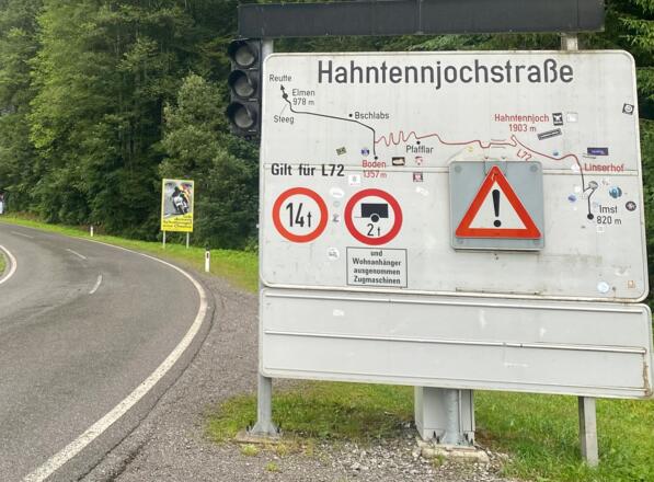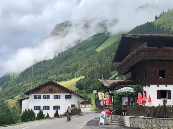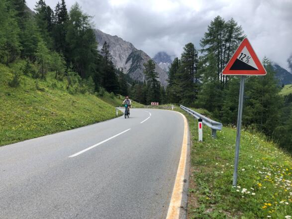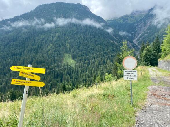 In Elmen gibt es noch einen Tante Emma Laden der zum Cappuccino mit Hörnchen einläd. Gut gestärkt geht es gleich steil hoch. Der erste Tunnel ist offen, luftig und gut zu fahren. Den nächsten Tunnel habe ich rechts umfahren, recht abenteuerlich auf einem gesperrten Schiebeweg und durch eine Furt. Ein rotes Blinklicht und eine reflektierende Weste ist die bessere Alternative. Der letzte Tunnel lässt sich gut rechts umfahren. In Bschlabs läd das Gasthaus zur Gemütlichkeit ein. Nach der Abzweigung Boden geht es 4km mit 12% konstant bergauf.
