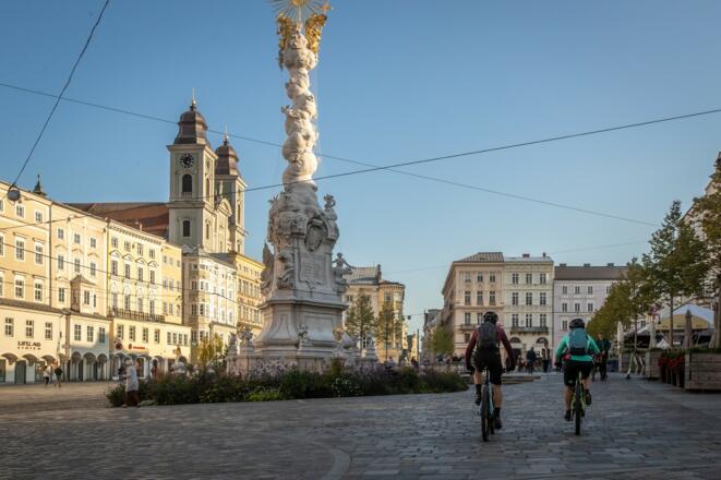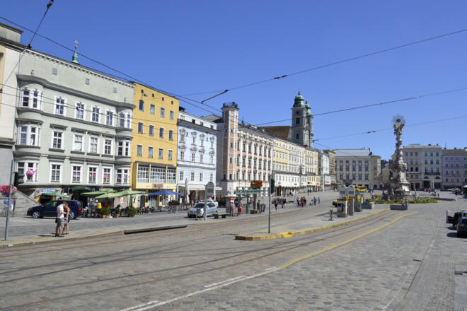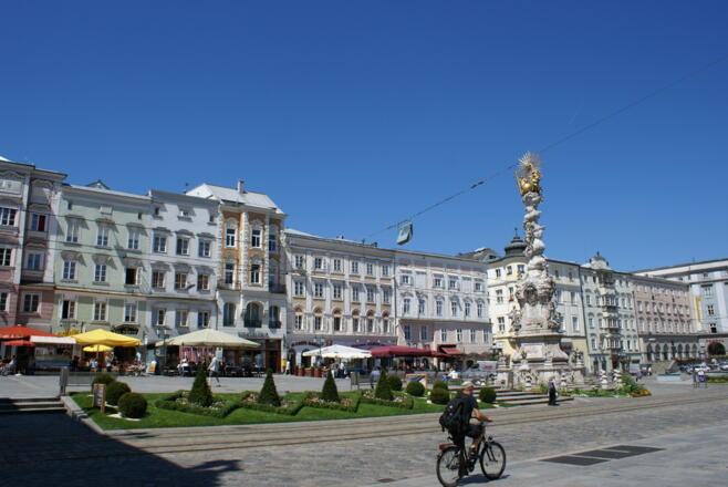 Häuser mit imposanten Fassaden begrenzen den Hauptplatz Linz der nahe der Donau gelegen ist. Viele davon haben einen wichtigen geschichtlichen Hintergrund. Beispiele dafür sind das Alte Rathaus, welches der Sitz des Linzer Bürgermeisters ist und wo man auch die Tourist Information Linz findet, das Gebäude der Linzer Kunstuniversität oder das Feichtinger-Haus, das das berühmte Glockenspiel beherbergt. Mitten am Hauptplatz befindet sich die 20 Meter hohe Dreifaltigkeitssäule.