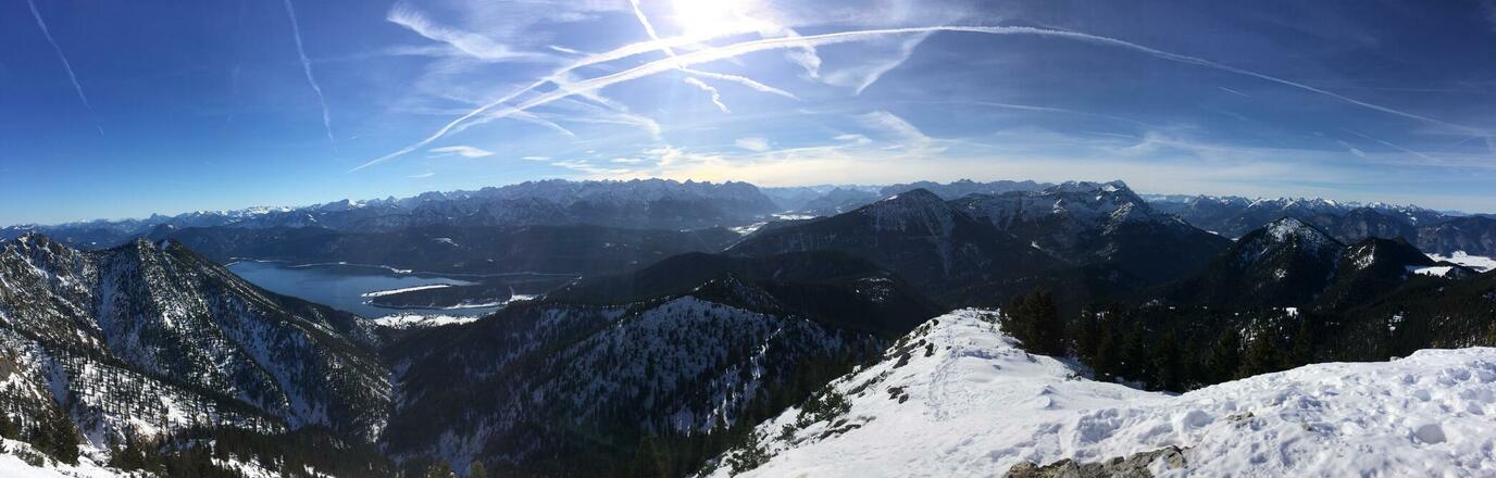Die mittelschwere Gratwanderung vom Herzogstand zum Heimgarten ist eine wahre Genusstour und bietet neben schönen Gipfelerlebnissen und gemütlichen Einkehrmöglichkeiten überwältigende Fernsichten. Im Norden reicht die Sicht bis weit in das Alpenvorland hinein, an klaren Tagen sogar bis München. Fein säuberlich aufgereiht präsentieren sich Ammersee, Staffelsee, Starnberger See und in unmittelbarer Nachbarschaft der Kochelsee. Im Osten zeigt sich der Walchensee in seinem leuchtenden Blau. Wenn wir unseren Blick den Alpen zuwenden, erkennen wir das naheliegende Karwendelgebirge, das Estergebirge sowie das Wettersteingebirge mit der Zugspitze. Dahinter präsentiert sich der Alpenhauptkamm mit seinen Dreitausendern.