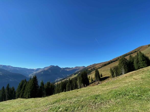 Mit der Gondel (oder Asphaltstraße) zur Bergstation der Reiterkogelbahn. Von dort geht es über breite Schotterwege zur Rosswaldhütte und weiter hinauf auf den Bergrücken nahe dem Kastelstein. Von da bergab erst noch auf breitem Weg und dann über den Hochalm Trail. Dieser mündet in eine Forststraße und dann weiter Talauswärts zurück nach Hinterglemm.