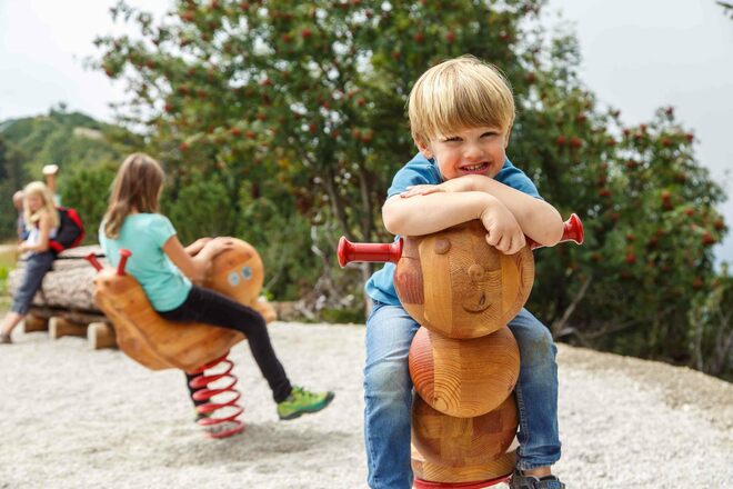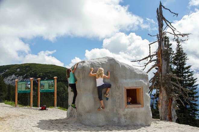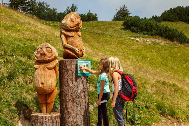 Von der Bergstation geht es auf dem Hauptweg und vorbei am Rauschberghaus direkt zum Eingangstor des Holzgeisterweges, wo Kölli schon auf seine Gäste wartet. Er schickt sie auf einen Rundweg, auf dem sich alles ums Holz dreht. Seit Ewigkeiten schon wird es in und um Ruhpolding abgebaut. Davon zeugen noch viele alte Holzdrifte - so etwas wie Wassertransportwege -, oder das Holzknechtmuseum im Ortsteil Laubau.