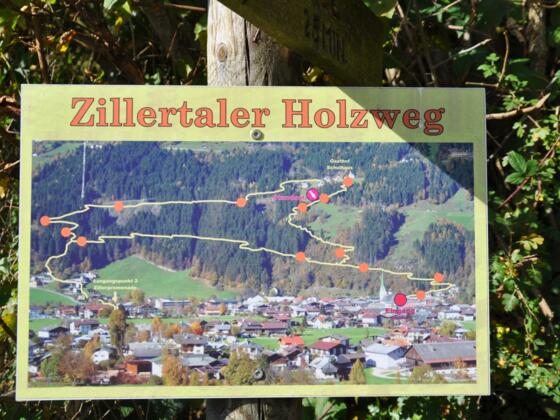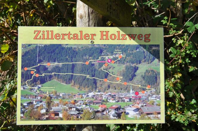 Vom Ausgangspunkt Zillerbrücke beim Autohaus Huber folgen Sie der Beschilderung bis zur Wegabzweigung Nr. 4 und Nr. 5. Der Erlebnisweg führt an der Josef-Kapelle vorbei, den Kreuzweg entlang bis zum Restaurant Schulhaus. Auf der Wanderung können Sie die Vogelstimmen erkunden, Interessantes über die Waldnutzung erfahren und einen tollen Blick über die Baumkronen erhaschen. Weiter geht es zur Herz-Jesu-Kapelle, den Weg Nr. 4 folgend ein kurzes Stück der Straße entlang taleinwärts. Durch einen dichten Wald gelangen Sie über die Eugenpromenade zurück zur Josef-Kapelle und zum Ausgangspunkt. Entdecken Sie die alpine Flora und Fauna und nehmen Sie die Natur auf dem Holzweg bewusster wahr!