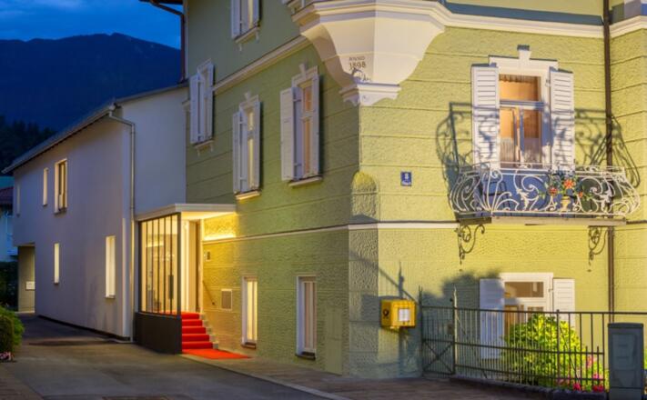 Ankommen und Wohlfühlen im Herzen der Alpenstadt Bad Reichenhall im Berchtesgadener Land. In bester Lage in der Alpenstadt Bad Reichenhall liegt die denkmalgeschützte Jugendstilvilla aus dem Jahre 1898. Die Villa, ein 3-Sterne-Nichtraucher-Hotel, wurde erst kürzlich renoviert und Sie enspannen nach einem erlebnisreichen Tag in modern ausgestatteten Komfort- oder Turmzimmern und genießen den Blick auf die Reichenhaller Bergwelt. Den Tag starten Sie mit einem vitaminreichen Frühstück vom Buffet mit bevorzugt regionalen Produkten. Gratis W-Lan und Parkplatz. Für Aktivitäten verschiedenster Art bieten sich direkt am Hotel viele Möglichkeiten: Wunderschöne Wander- und traumhafte Radwege warten auf Sie! Gönnen Sie sich eine Auszeit und tanken Sie Ihre Energie in den umliegenden alpinen Kureinrichtungen wieder auf. Das i-Tüpfelchen ist der Besuch der nur 400 m entfernten RupertusTherme für Groß und Klein. Besonderes Angebot für Sie "Bergerlebnis"
