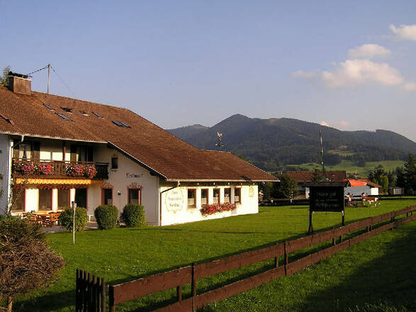 Unser Restaurant ist im bayrischen Stil gehalten und mit Liebe zum Wohlfühlen ausgeschmückt. Sonnenterrasse mit Blick auf das Gebirge, kleiner Teich mit Springbrunnen und Übergangsbrücke, Liege- und Ruhewiese. Für Motorisierte sind genügend Park- und Unterstellplätze vorhanden. Herzensbedienung. Kräutergarten, in dem Gäste ihre Kräuter auch selbst zum Salat ernten können.
