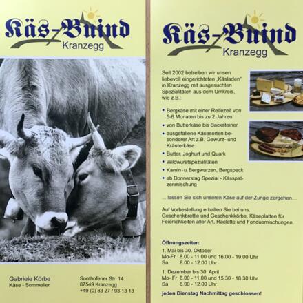 Eine Käse - Sommelierin die begeistert im schönen Oberallgäu in Kranzegg. Käsespezialitäten die auf der Zunge zergehen. Der kleine hübsche, rustikale Käs-Buind besticht mit regionalen Feinkostspezialitäten. Diese werden von Gabi Körbe die ausgebildete Käse-Sommelierin ist, mit viel Liebe ausgesucht.