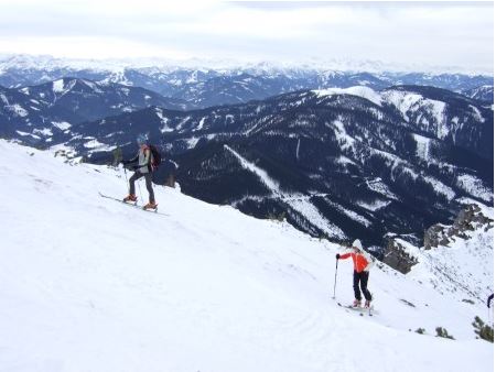 Vom Losegg geht es über die Mah- und Ledringeralm im Abfahrtsrausch weiter auf eine Forststraße bis nach Mauerreith. Fährt man bis ins Tal ab, ist vom Parkplatz rechts der kurze Gegenanstieg ohne Felle zu bezwingen (30 Höhenmeter) und nach einem Waldstück geht die Genussabfahrt bis ins Tal weiter, wobei man ein paar mal die Straße quert – auf möglichen Verkehr achten!